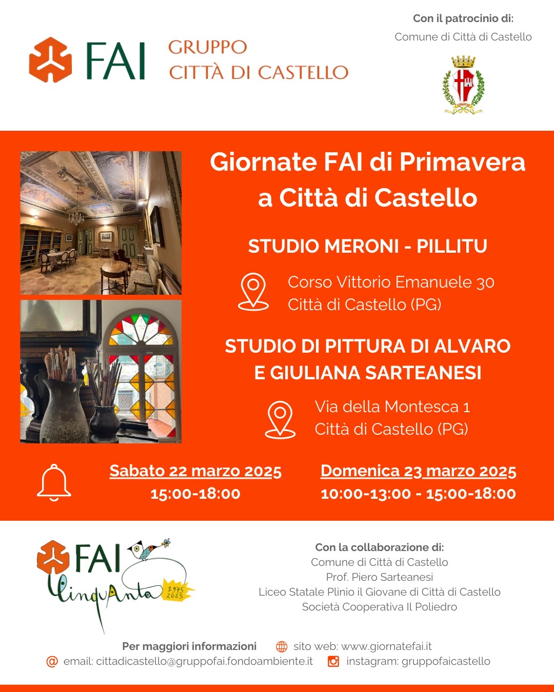 Percorso nel centro storico tifernate alla scoperta di due luoghi suggestivi ed eccezionalmente aperti al pubblico come lo Studio Meroni Pillitu e lo Studio di pittura di Alvaro e Giuliana Sarteanesi: queste le visite organizzate sabato 22 e domenica 23 marzo dal Gruppo FAI di Città di Castello in occasione delle Giornate di Primavera, con il patrocinio del Comune di Città di Castello e la collaborazione del Prof. Piero Sarteanesi. L’iniziativa del Fondo Ambiente Italiano ETS, giunta ormai alla XXXI edizione, è il più importante evento di piazza dedicato al patrimonio culturale e paesaggistico d’Italia e alle storie inedite che custodisce: in occasione dei Cinquanta anni dalla nascita del FAI nazionale saranno visitabili in tutta Italia oltre 750 luoghi in 400 città.