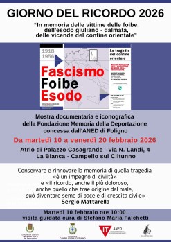 In occasione del Giorno del Ricordo 2026, il Comune di Campello sul Clitunno rende omaggio alla memoria delle vittime delle foibe e dell’esodo giuliano-dalmata con l’apertura della mostra documentaria e iconografica “Fascismo, Foibe, Esodo”.