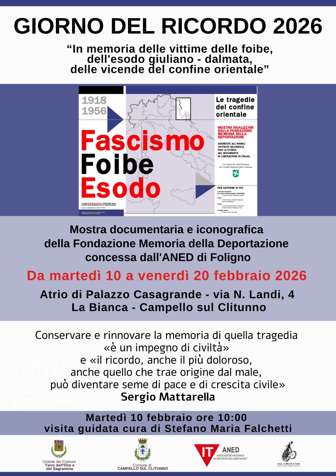 La mostra, realizzata dalla Fondazione Memoria della Deportazione e concessa dall’ANED di Foligno, propone una ricostruzione storica rigorosa degli eventi compresi tra il 1918 e il 1956. Attraverso documenti e immagini, il percorso espositivo intende “conservare e rinnovare la memoria”, raccogliendo l’auspicio del Presidente della Repubblica Sergio Mattarella affinché il ricordo diventi “seme di pace e di crescita civile”.