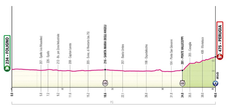 La partenza del primo corridore Julius Van Den Berg da Foligno è alle ore 13, mentre la Maglia Rosa Tadej Pogacar scatterà alle 16.22. L’arrivo a Perugia del primo corridore è attesa intorno alle 13.52, quello della Maglia Rosa alle 17.09. I suoi principali avversari, Daniel Martinez e Geraint Thomas, partiranno rispettivamente alle 16.18 e 16.21. Tra gli atleti italiani, Domenico Pozzovivo partirà alle 15.36; Lorenzo Fortunato alle 16.09; Filippo Ganna alle 14.37. (qui l’ordine completo di partenza).