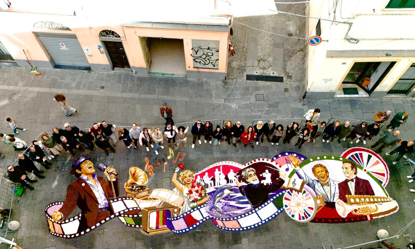 Dietro la bellezza dell’opera, un lavoro meticoloso e una lunga notte: oltre 14 ore di infioratura a terra, iniziate alle 3.30 del mattino e proseguite fino al tardo pomeriggio, sotto gli occhi curiosi e ammirati di cittadini e turisti accorsi per il festival dei fiori. Un impegno che, in realtà, era cominciato già il giorno precedente, con la preparazione: montaggio della struttura protettiva, fissaggio del disegno a terra e avvio della “capatura” dei fiori freschi. Gerbere, ranuncoli, garofani, crisantemina, semprevivo, insieme a elementi vegetali come finocchio e pino: una tavolozza naturale, selezionata con cura per restituire tutte le sfumature cromatiche previste dal bozzetto.