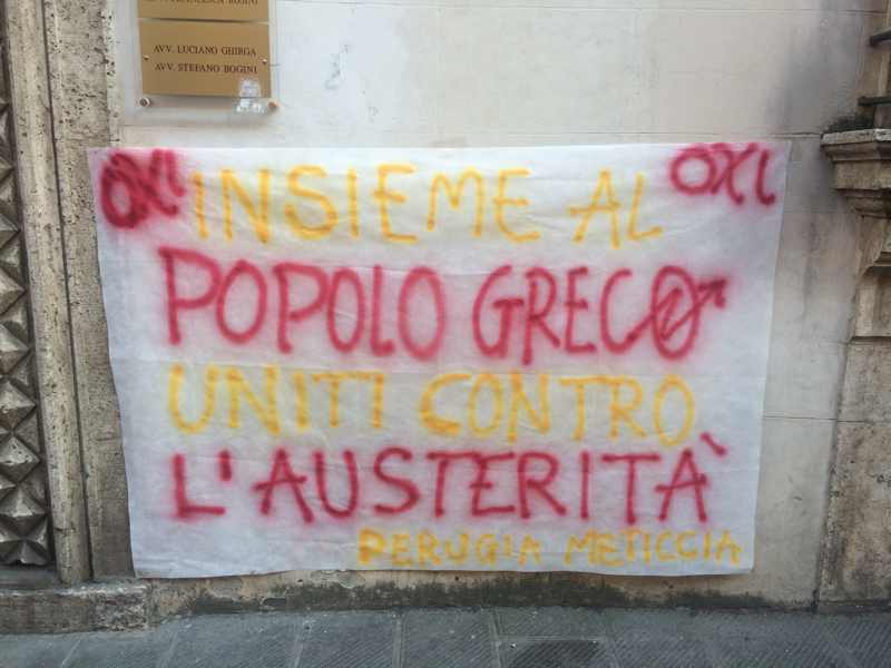 Due manifestazioni a Perugia, politicamente per principio distinte, ma che alla fine si sono riunite nello stesso grido, quello del sostegno al “no” per il referendum che vedrà Atene, e il popolo greco, scegliere se accettare o meno le proposte della Troika e di Junker: nuovi tagli alle pensioni, obiettivi rigidi di avanzo primario, una dura riforma fiscale, tagli alle spese militari, privatizzazioni e liberalizzazione del mercato del lavoro.