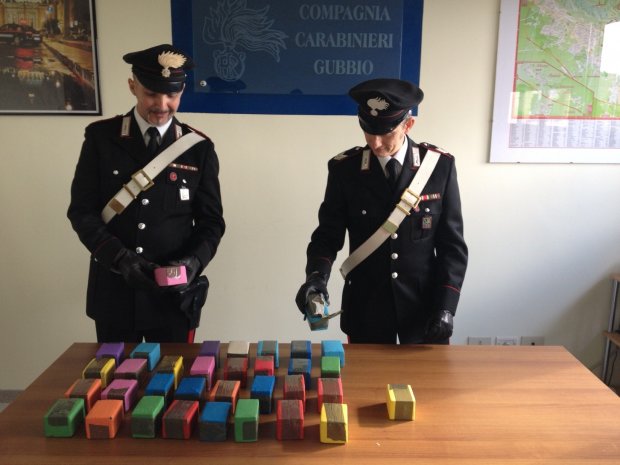 Indagini approfondite hanno permesso ai militari della Compagnia Carabinieri di Gubbio di accertare che i due uomini avrebbero raggiunto l’Umbria nella mattinata di oggi: pertanto sono stati attivati specifici servizi di controllo ed osservazione. Una volta giunto il bus nei pressi dell’albergo ed atteso il momento propizio, i militari hanno deciso di entrare in azione e sottoporre a perquisizione personale la camera d’albergo, il bus nonché i due soggetti. Le perquisizioni hanno dato esito positivo in quanto sono stati rinvenuti, nella celletta frigorifera del bus 17 kilogrammi di hashish divisi in 34 confezioni da 500 grammi ciascuna. Ciascuna confezione, poi, era nastrata e ricoperta con dei palloncini al fine di confondere il fiuto dei cani in caso di eventuale controllo.