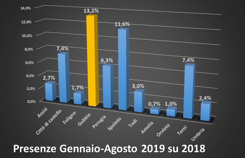 Gubbio regina del Turismo in Umbria. Nei primi 9 mesi del 2019, infatti, la Città dei Ceri ha registrato la migliore performance di crescita delle presenze (+13,2%) fra i Comuni capofila dei comprensori turistici umbri, con una media regionale ferma al +2,4% (dati definitivi).