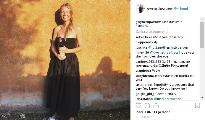 Non è l’unico precedente umbro della Paltrow, che già nel 2017 era stata avvistata in Umbria: allora, per le vacanze estive, l’attrice aveva scelto Città di Castello e zone limitrofe, venendo paparazzata al mercato settimanale e al bar. Gli indizi lasciati sui social avevano lasciato pensare al Castello di Reschio, nella zona di Lisciano Niccone, un vero e proprio paradiso immerso nella natura. Anche allora l’attrice si era congedata dall’Umbria con una foto del tramonto: ‘Last sunset in Umbria’ la didascalia dello scatto, dove la star indossava un lungo abito nero e aveva in mano una bottiglia di vino.