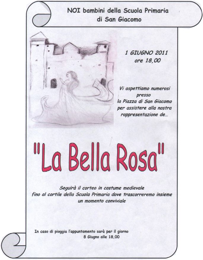 Torna a San Giacomo “La bella Rosa”, messo in scena questa volta da tutti i bambini della scuola primaria di San Giacomo. La piece sarà rappresentata in Piazza il giorno 1 giugno alle ore 18,00. Al termine dello spettacolo, seguirà un corteo in costume medievale fino al cortile della scuola primaria, dove tutti gli spettatori sono invitati ad un momento conviviale organizzato dagli insegnanti, dai bambini e dai loro genitori. La scuola fa inoltre sapere che in caso di pioggia l'appuntamento verrà posticipato all'8 giugno prossimo nello stesso luogo ed ora. Tutti sono invitati a partecipare.