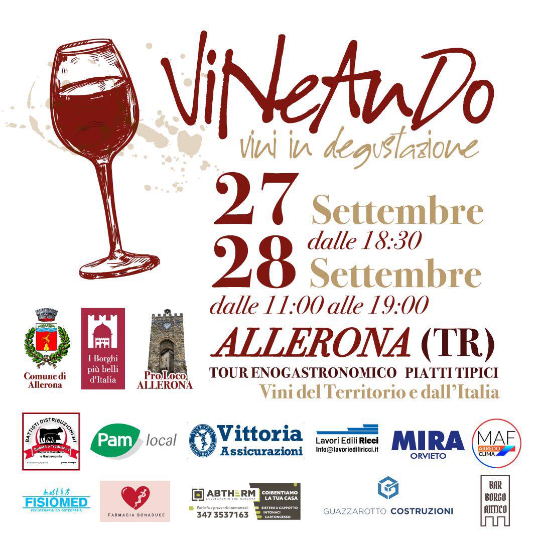 In uno dei borghi decretato tra i più belli d’Italia, Allerona, Comune amico delle api, torna sabato 27 e domenica 28 settembre 2025, la manifestazione “VINEANDO – Festa del vino edizione 2025”, per un tour enogastronomico con piatti unici e vini dal territorio locale e dall’Italia, con degustazioni guidate, vini pregiati, piatti tipici della cucina umbra e prodotti del territorio, ideato da Davide Franzini ed organizzato dalla Pro Loco di Allerona.