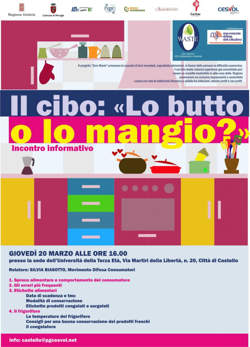 L'incontro di giovedì, rientra nel più ampio progetto Zero Waste, progetto che vuole diffondere una cultura del consumo sostenibile e recuperare le eccedenze alimentari a favore delle categorie bisognose. Zero Waste nasce in sinergia con le esperienze già presenti sul territorio attuate dalla Caritas di Città di Castello, dal Banco Alimentare dell’Umbria e dall’associazione il Samaritano di Perugia e con il sostegno istituzionale della Regione Umbria, delle amministrazioni locali di Perugia e della Zona sociale 1 Città di Castello. È stato approvato all’interno del Programma di contribuzioni 2012 di Philip Morris Italia attraverso il Fondo VGE–PMI.