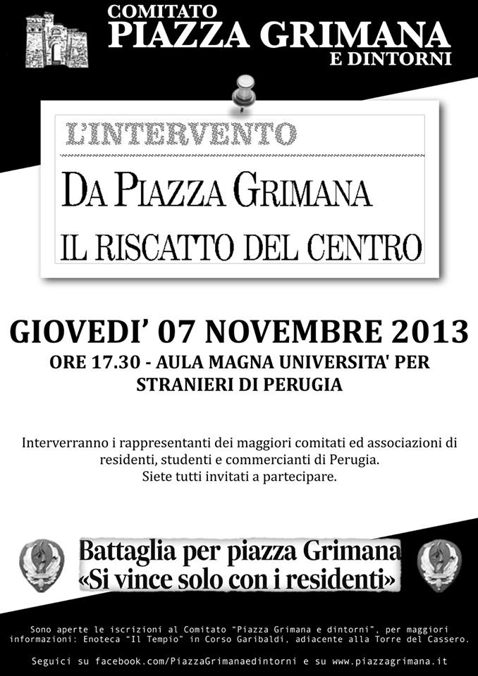 Il “Comitato per Piazza Grimana e dintorni” non si ferma. Dopo il successo dell'assemblea del 2 settembre scorso, torna alla carica con una nuovo iniziativa che si terrà oggi alle 17.30 nell'Aula Magna dell'Università per Stranieri.