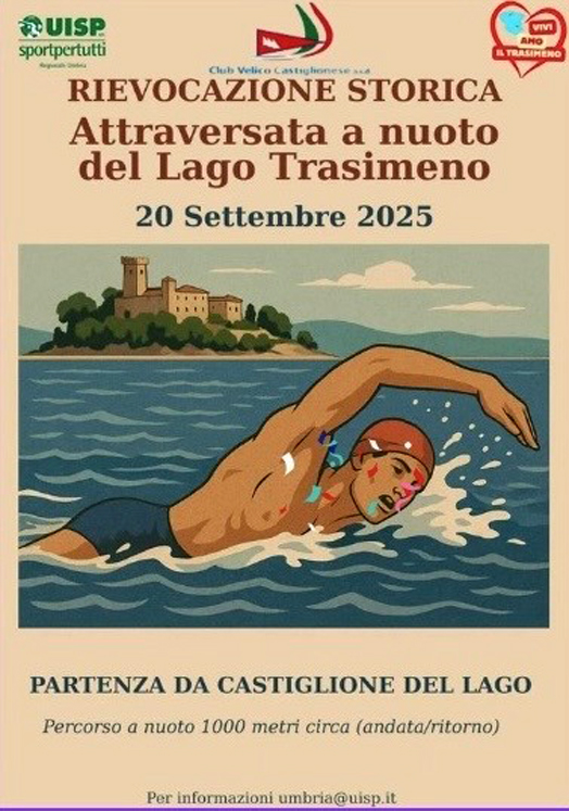 Nella mattina di sabato 20 assoluto protagonista è il Trasimeno. La UISP Umbria (Settore Nuoto) organizza la rievocazione storica dell’Attraversata a nuoto del Lago Trasimeno, un evento che unisce sport, memoria e valorizzazione del territorio, in collaborazione con il Club Velico Castiglionese. La manifestazione partirà alle ore 9 dalle sponde del Lago Trasimeno a Castiglione del Lago e si concluderà intorno alle ore 12 con un percorso di 1000 metri. «L’iniziativa – spiega il presidente Uisp regionale Fabrizio Forsoni – vuole rievocare un’impresa simbolica legata al rapporto tra uomo, acqua e natura, rilanciando al tempo stesso i valori di partecipazione, sostenibilità e benessere che contraddistinguono l’attività UISP. La rievocazione sarà accompagnata da momenti di aggregazione, in un contesto che unisce lo sport popolare alla promozione culturale e turistica del territorio del Trasimeno». L’appuntamento è aperto al pubblico, che potrà assistere alla partenza e seguire lo svolgimento dell’attraversata dalle rive del lago. Per informazioni: UISP Regionale Umbria umbria@uisp.it cell 3408061635.