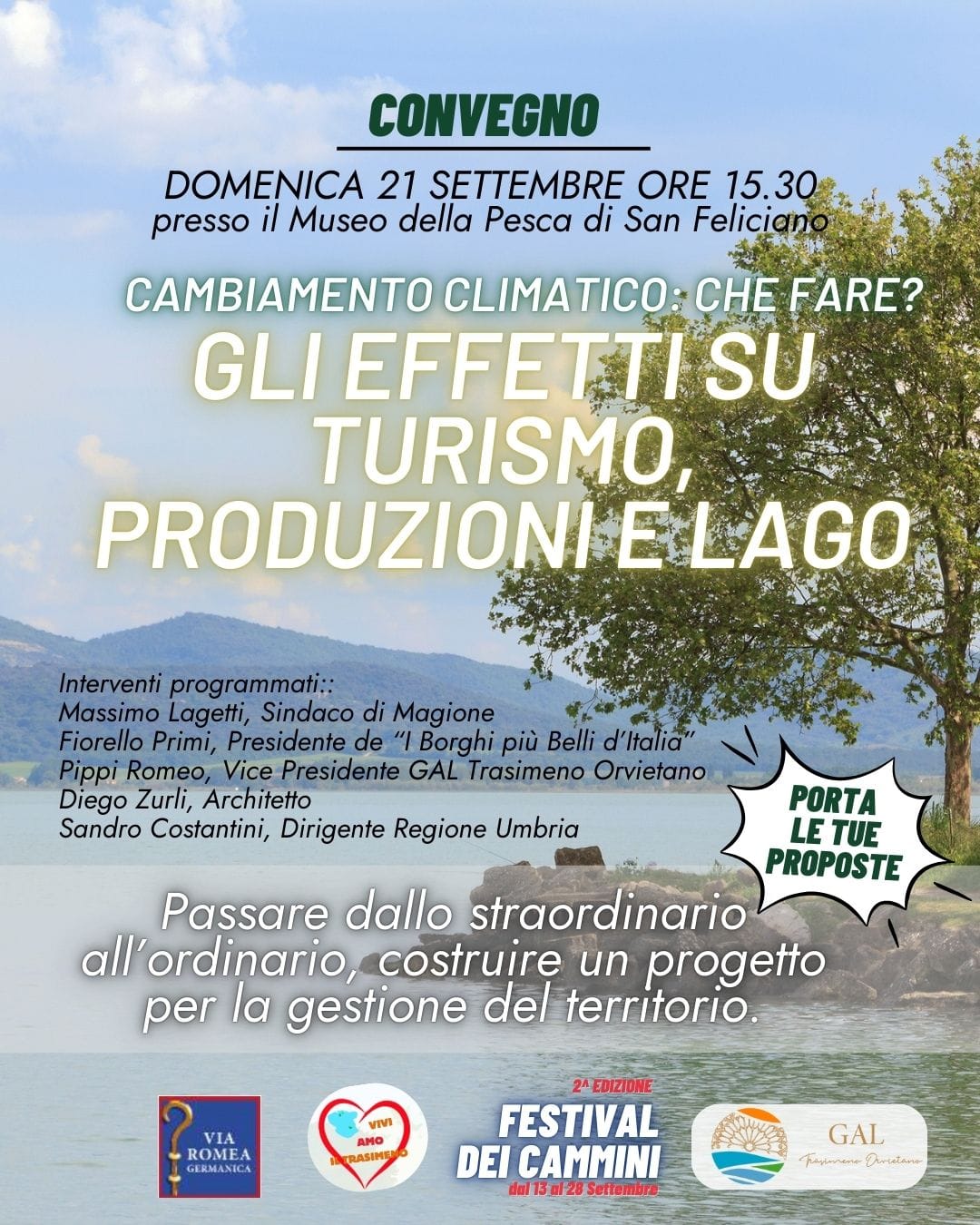 L’ambiente ed il cambiamento climatico, passare dallo straordinario all’ordinario, costruire un progetto per la gestione del territorio, saranno i protagonisti del convegno di domenica 21 settembre alle ore 15:30, presso il Museo della Pesca di San Feliciano, dal titolo “Cambiamento climatico: che fare? Gli effetti su turismo, produzioni e lago”. Interverranno il sindaco di Magione Massimo Lagetti, il presidente dell’associazione “I Borghi più Belli d’Italia”, il vice presidente del GAL Trasimeno Orvietano Romeo Pippi, l’architetto Diego Zurli e il dirigente della Regione Umbria Sandro Costantini. Alle ore 19 sempre a San Feliciano un aperitivo al tramonto.