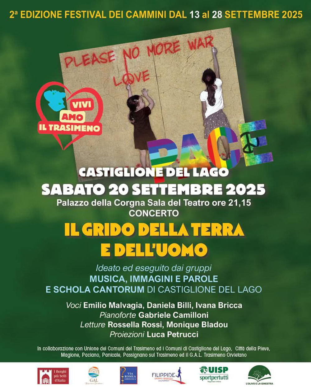 Le stesse tematiche si ritrovano nel concerto di sabato sera alle ore 21:15 presso la Sala del Teatro di Palazzo della Corgna. Il gruppo “Musica, immagini e parole” insieme alla Schola Cantorum di Castiglione del Lago presenterà lo spettacolo “Il grido della terra e dell’uomo” nel quale l’argomento del rispetto dell’ambiente, che inizierà con un omaggio a San Francesco e al Cantico delle Creature, si intreccerà con l’altro di grande attualità che è quello del rifiuto della guerra e della lotta per la pace, unico modo di vivere la vita e di ricongiungersi con l’eterno.