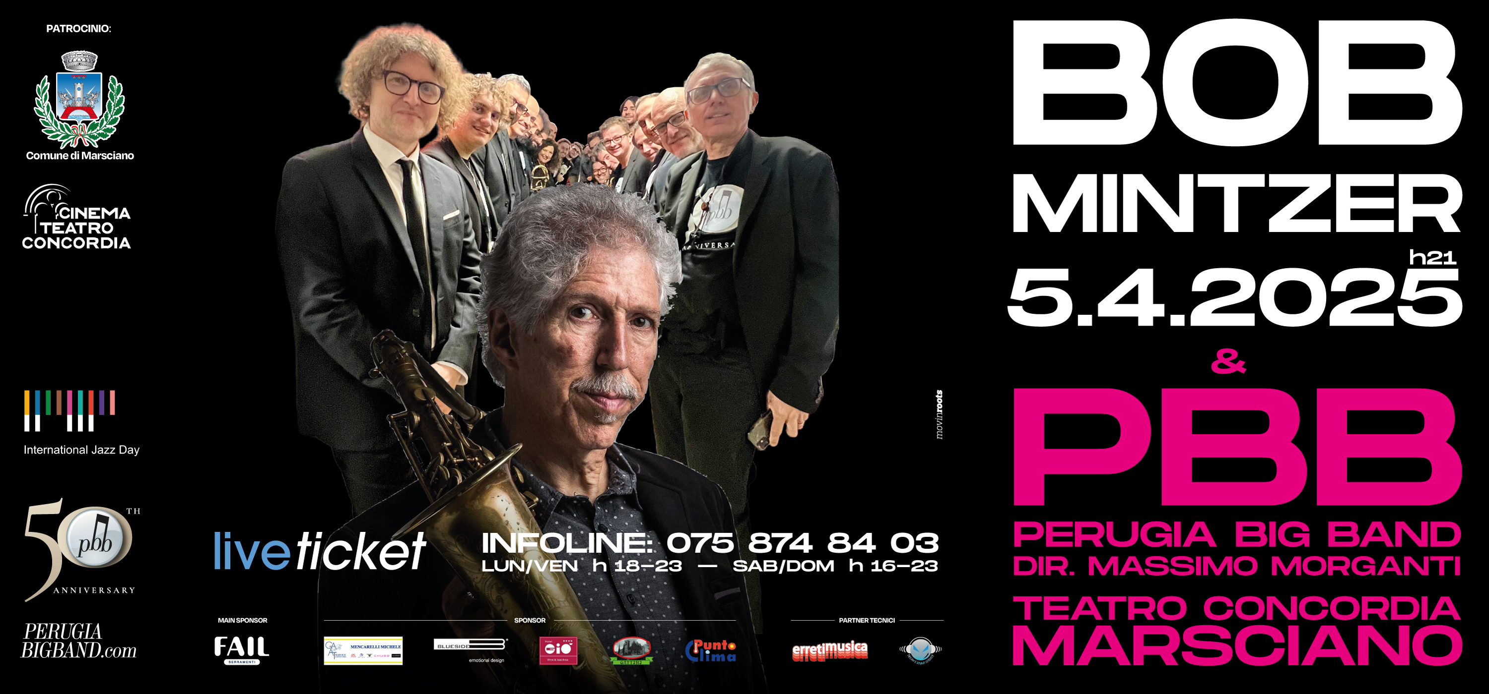 Un evento unico ed esclusivo curato dall’Associazione Culturale Perugia Big Band e reso possibile dal Comune di Marsciano, in cui il leggendario Bob Mintzer salirà sul palco del Teatro Concordia insieme alla PBB, formazione di eccellenza diretta da Massimo Morganti, per presentare un programma musicale vibrante e coinvolgente, dalla straordinaria varietà stilistica. Dalle sonorità fusion contemporanee e gli arrangiamenti che sprigionano tutta l’energia del grande jazz orchestrale, emerge immediatamente la profondità emotiva che caratterizza la scrittura di Mintzer e la potenza interpretativa della big band.