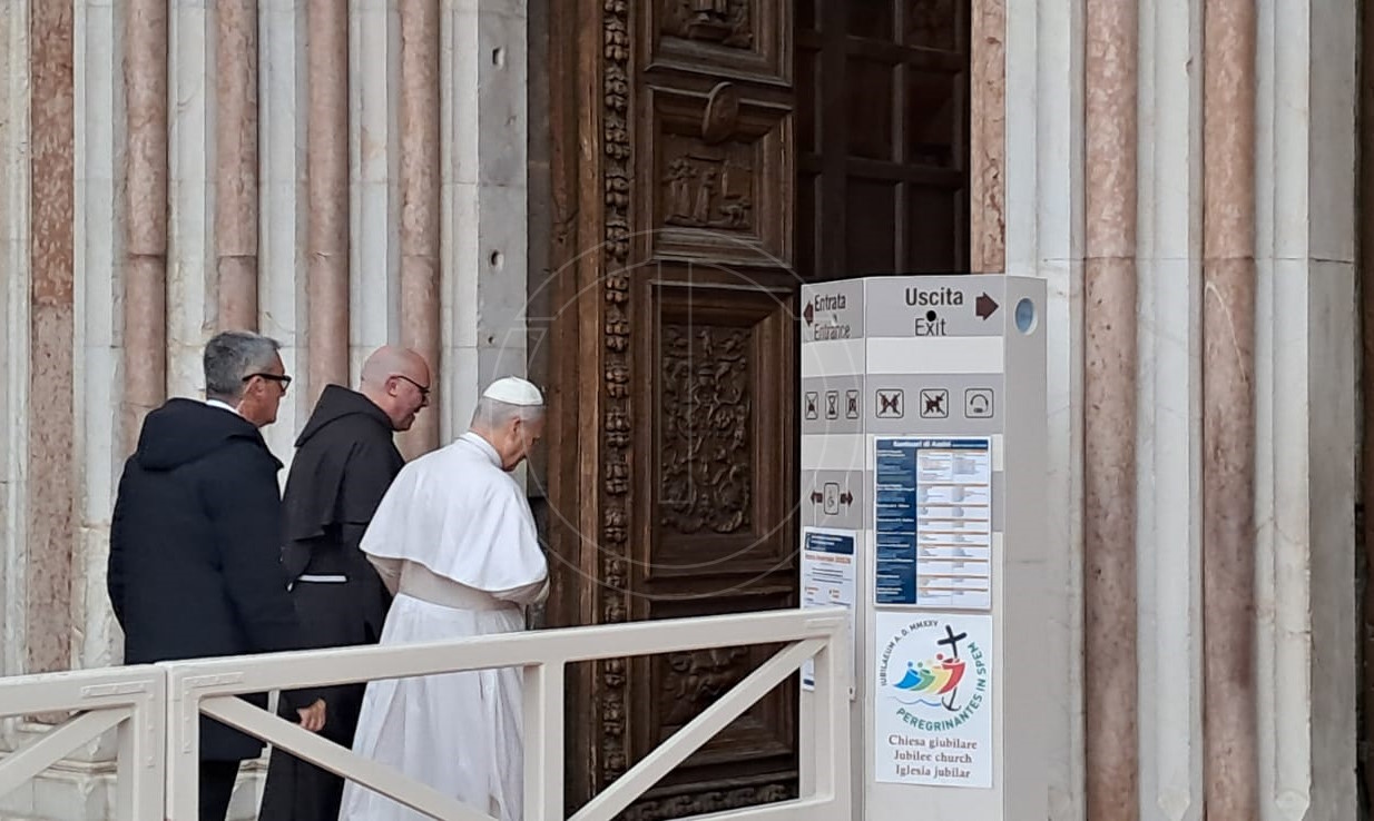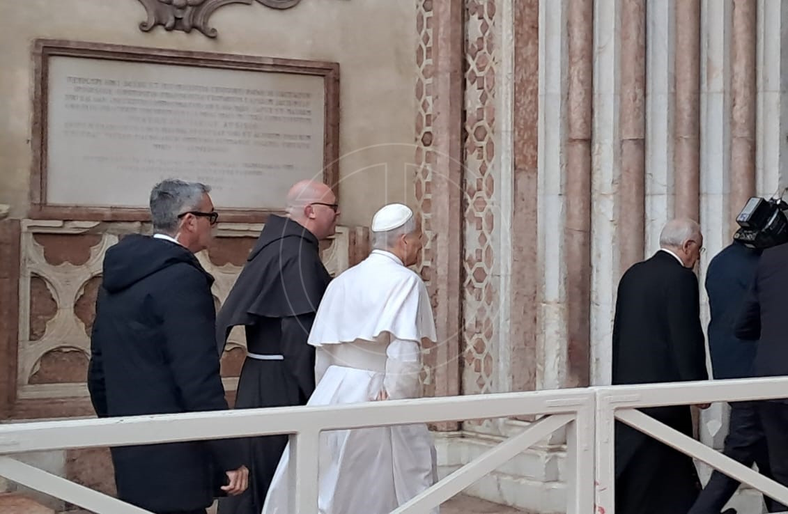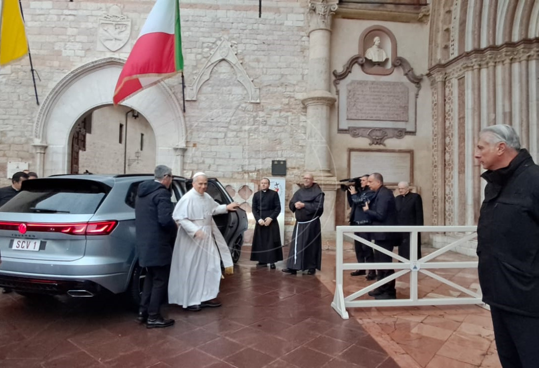 È un filo lungo che va Gregorio IX, il Papa che canonizzò San Francesco, a Papa Leone XIV, quello delle visite dei Papi ad Assisi: Prevost è il ventesimo pontefice ad arrivare in città, per una visita che è allo stesso tempo lampo e significativa. Il pontefice, invitato per chiudere l’81ª assemblea generale della Conferenza episcopale italiana, riunita alla Domus Pacis dal 17 novembre, si muoverà tra Assisi e Montefalco. Di mattina la visita a San Francesco, per una breve preghiera con la comunità conventuale della Basilica di San Francesco. Atterrato allo stadio Migaghelli poco dopo le 8 e accolto dalle autorità civili e religiose, è arrivato nella chiesa inferiore intorno alle 8.35, per poi spostarsi dopo neanche un quarto d’ora nella basilica di Santa Maria degli Angeli e lasciare Assisi per Montefalco poco prima delle 11.