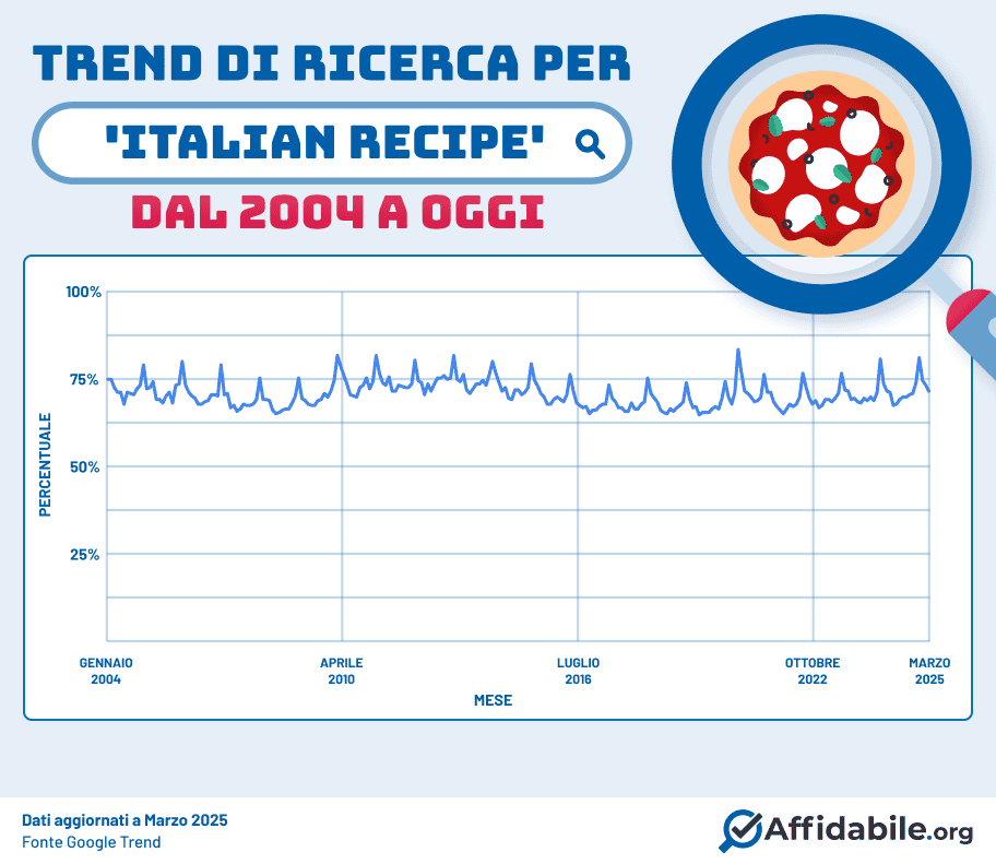 Sono questi in sintesi i risultati dell’ultima indagine di Affidabile.org, che ha l’obiettivo di individuare le tendenze rispetto alle ricerche globali sul cibo italiano. I dati sono stati rilevati tramite Google Trends e il periodo di riferimento copre l’arco temporale che va da Gennaio 2004 a Marzo 2025, prendendo in considerazione tutti i paesi del mondo, Italia inclusa.