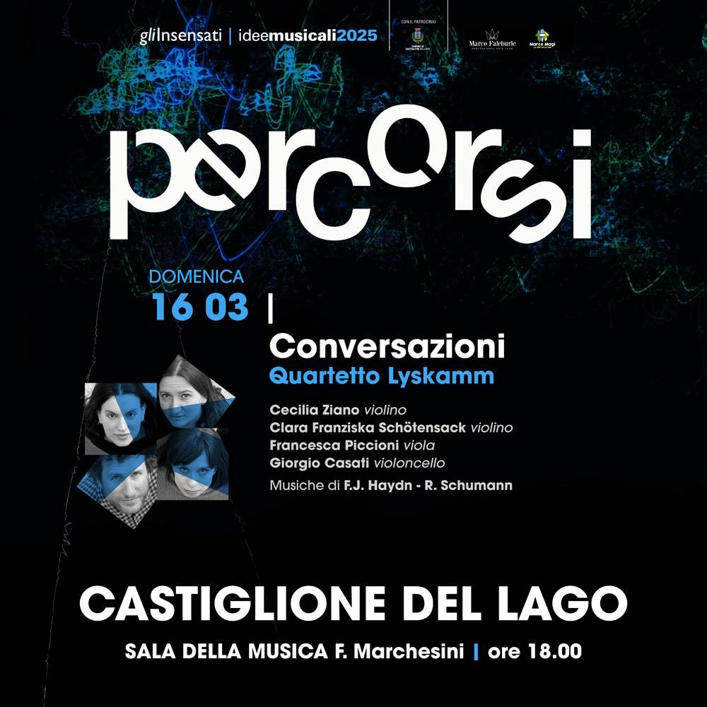 L’associazione “Gli Insensati”, che organizza la rassegna con il patrocinio del Comune di Castiglione del Lago, porta nella Sala della Musica “Franco Marchesini” un quartetto di giovani musicisti che vanta una carriera concertistica internazionale di altissimo livello, ottenendo numerosissimi premi di prestigio. Il Quartetto Lyskamm, fondato nel 2008 al Conservatorio di Milano, è composto da quattro musicisti italiani: Cecilia Ziano (violino), Clara Franziska Schötensack (violino), Francesca Piccioni (viola) e Giorgio Casati (violoncello). Il quartetto è stato ospite di numerose società concertistiche in Italia e in Europa come la “Società del Quartetto” di Milano, il “Festival Mito”, l’Unione Musicale e Lingotto Musica a Torino, il festival “I suoni delle Dolomiti”, la “Società del Quartetto” di Bergamo, il festival internazionale Quatuor a Bordeaux (Francia), l’Aldeburgh Music Festival (Gran Bretagna), il Brahms Festival di Lubecca e il Rheingau Musik Festival (Germania). Il quartetto è stato “quartetto in residence” agli “Amici della musica di Padova” per il biennio 2015-2017 e all’Accademia Filarmonica Romana per il triennio 2019-2022 eseguendo l’integrale dei quartetti di Bartók e l’op.18 di Beethoven.