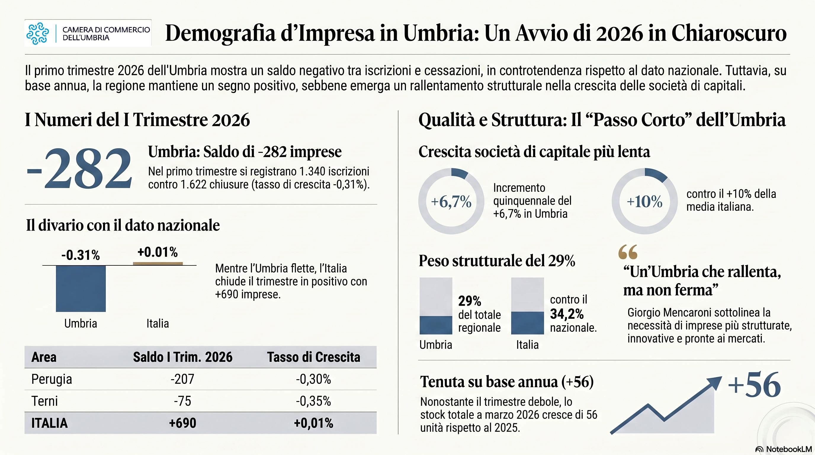 Commenta Giorgio Mencaroni, presidente della Camera di Commercio dell’Umbria: “Il dato del primo trimestre ci consegna un’Umbria che rallenta, ma non una regione ferma. Il saldo negativo va letto con attenzione, senza sottovalutarlo, ma anche senza perdere di vista il fatto che, su base annua, il tessuto imprenditoriale ha ancora mostrato capacità di tenuta. La sfida vera, oggi, è accompagnare questa tenuta verso una crescita più solida, con imprese più strutturate, più innovative e più pronte a stare nei mercati che cambiano”.