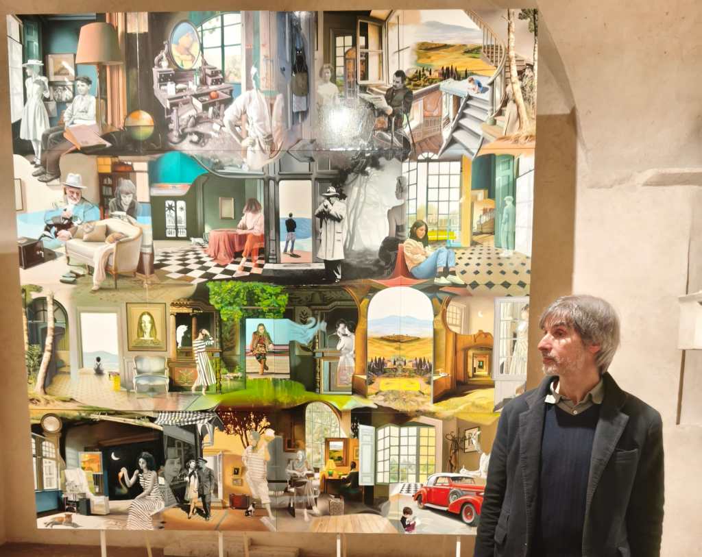 Sedici dipinti disposti in quattro file da quattro, per un Polittico di 3×3 metri. Ogni quadro mantiene una propria autonomia narrativa, ma si collega agli altri, creando un mosaico visivo e concettuale che riflette i legami tra identità, memoria e storia collettiva. Si presenta così “Domino – La Storia siamo noi”, progetto espositivo di Davide Querin inaugurato a Palazzo Trinci di Foligno sabato 21 febbraio. Arte contemporanea che nasce dall’estro creativo dell’artista romano, conosciuto soprattutto come il pittore delle trasparenze, che si unisce, fino al 13 marzo, in maniera suggestiva alle già ricche, di storie, sale affrescate dello spazio cuore civico e museale della città umbra.