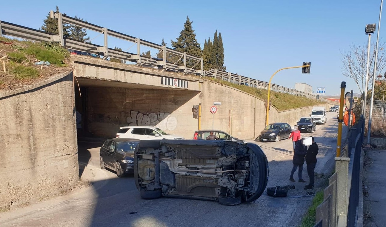 Incidente in via della Valtiera, a Ponte San Giovanni, con un’auto che dopo l’urto ha perso una ruota ed è rimasta in mezzo alla strada, su un fianco. L’incidente è avvenuto all’altezza del sottopasso della E45.