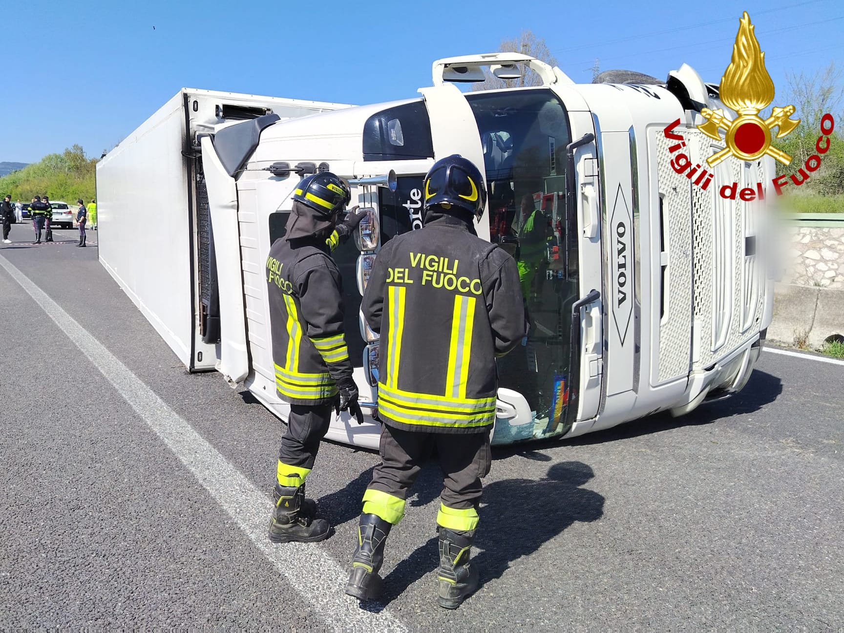 I vigili del fuoco sono in azione per la rimozione del mezzo pesante, operazione complessa al termine della quale la viabilità potrà tornare regolare.