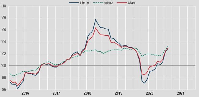 A febbraio 2021, fra le attività manifatturiere, gli aumenti tendenziali più elevati riguardano i settori Metallurgia e fabbricazione dei prodotti in metallo (+4,2% mercato interno, +5,8% area euro, +2,8% area non euro) e altre industrie manifatturiere, riparazione e installazione di macchine e apparecchiature (+3,1% area non euro). Le flessioni più ampie si rilevano per coke e prodotti petroliferi raffinati (-2,1% mercato interno, -7,6% area euro), prodotti farmaceutici di base e preparati farmaceutici (-2,9% area non euro) e prodotti chimici (-2,9% area euro, -2,0% area non euro).