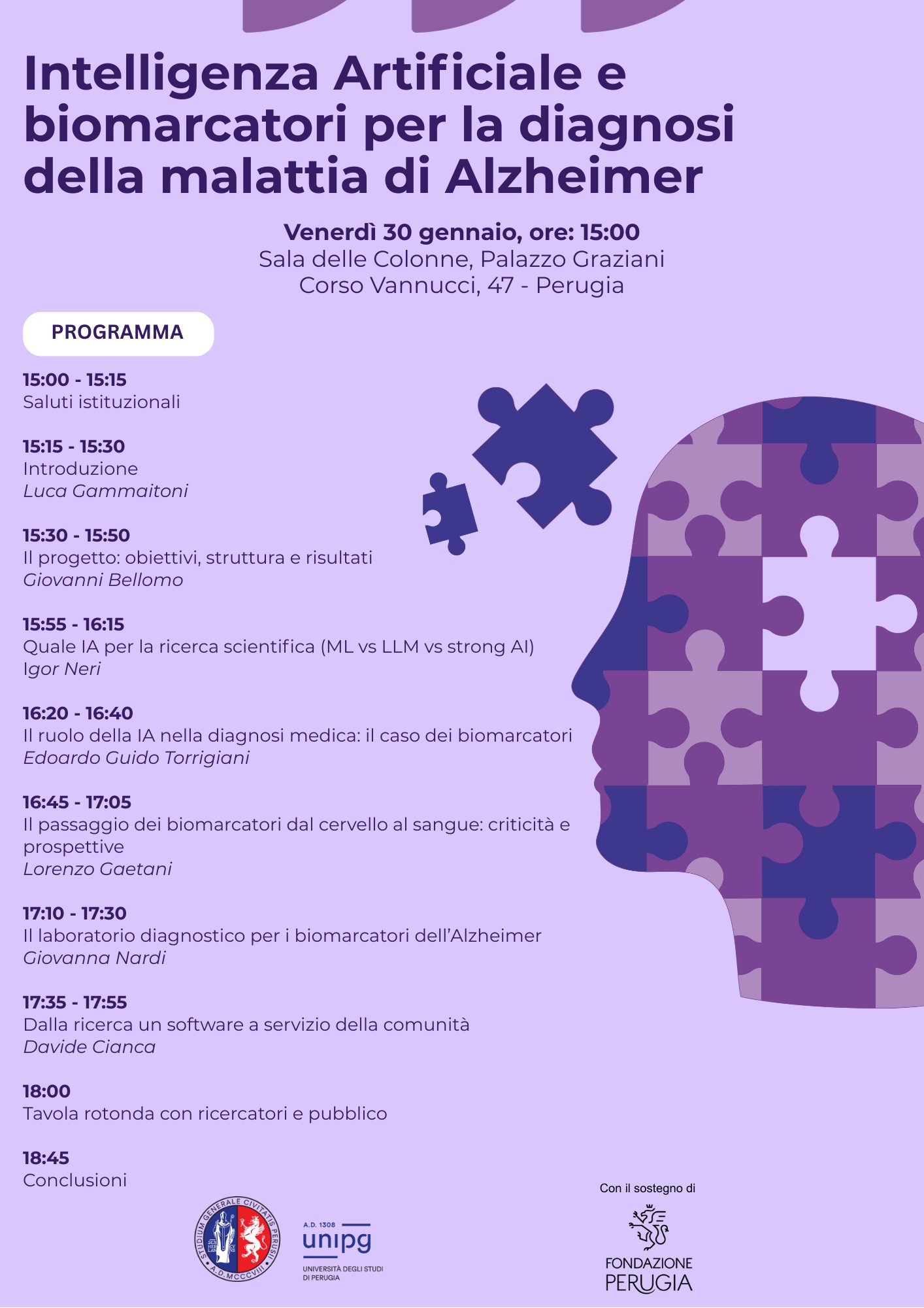 L’Intelligenza Artificiale incontra la ricerca biomedica per affrontare una delle principali sfide della medicina contemporanea: la diagnosi precoce della malattia di Alzheimer. Venerdì 30 gennaio, a partire dalle ore 15.00, presso la Sala delle Colonne di Palazzo Graziani, si terrà l’incontro “Intelligenza Artificiale e biomarcatori per la diagnosi della malattia di Alzheimer” organizzato dal Laboratorio NiPS del Dipartimento di Fisica e Geologia dell’Università degli Studi di Perugia, con il sostegno di Fondazione Perugia.