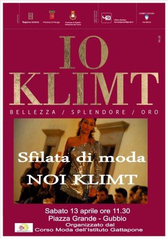 Le alunne del Corso Moda IPSIA dell’Istituto Gattapone di Gubbio presenteranno, coordinate dallo stilista eugubino Luca Tomassoli, 30 abiti della collezione ispirata a Gustav Klimt, costituita da capi in grado di vestire la donna in tutte le occasioni, sia quotidiane che particolari. Inconsueti vestiti da sposa, vestiti da sera eleganti e chic, tailleur e abiti da mattino o pomeriggio dai toni e dalle fantasie che richiamano i motivi decorativi cari all’artista. Questo defilé, presentato presso la Biblioteca Sperelliana nell’inverno appena trascorso, è il prodotto di una lunga progettazione inserita anche nell’ambito dell’area professionalizzante, la cosiddetta Alternanza scuola – lavoro, che ha visto protagoniste le studentesse dell’Istituto professionale, in quanto partecipi della fase di ideazione e quella di realizzazione pratica dei capi con il prezioso ausilio di docenti ed esperti sia interni che esterni. La sfilata vede la collaborazione del dirigente Scolastico Francesca Cencetti, il Dsga Stefano Biccari e la sig.ra Daniela Vispi, La Truccatrice Martina Fiorucci, Dj Sanny, Il Prof. Falleri Giordano per le fotografie, e soprattutto le docenti dell’area di indirizzo: Anna Flamini, Paola Viscuso e l’Assistente Tecnico Paola Ciavaglia che hanno accolto la proposta dell’Assessore Marco Bellucci e dell’organizzazione 4aMedia, di realizzare proprio durante l’esposizione artistica una sfilata rivisitata con l’aggiunta di nuovi abiti sempre ispirati a Klimt. Con questo ultimo evento collaterale si conclude la serie di Bellezza, Splendore e Oro di cui Klimt è protagonista assoluto. Da Io KLIMT a NOI KLIMT, un collettivo che ha tratto da questa esperienza tutte le sfumature che l’artista stesso ha consegnato alla storia dell’arte. Soddisfazione viene espressa dall'Assessore alla Cultura Marco Bellucci: “Grazie alla capacità di coinvolgere il territorio nelle sue diverse componenti, quella dell'istruzione e quella dell'artigianato, la mostra Io Klimt ha saputo qualificarsi anche per qualità ed interrelazione culturale. Visto il successo di visite alla mostra, grazie alla quale il Museo del Palazzo dei Consoli non a caso ha visto crescere sia a febbraio che a marzo le visite totali fino a circa 3400 visitatori (gli ingressi alla mostra ad oggi ammontano a 1100), si è deciso di prorogarla e resterà ancora nella sala dell’Arengo di Palazzo dei Consoli fino al 21 Aprile.”