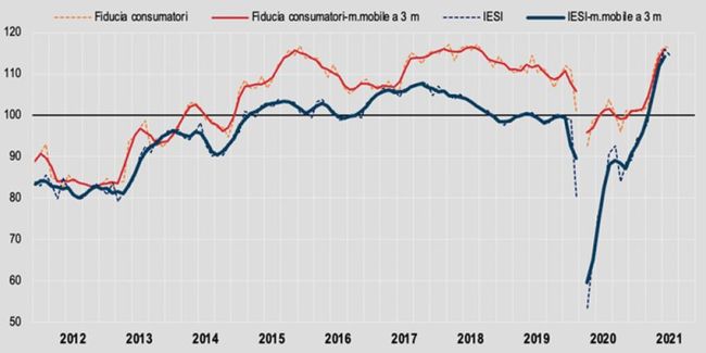 Il lieve calo della fiducia dei consumatori è la sintesi di variazioni eterogenee tra le sue componenti. In particolare, la componente personale scende da 112,2 a 110,8 e quella futura da 123,5 a 122,5 mentre il clima economico aumenta da 129,6 a 132,4 e quello corrente rimane sostanzialmente stabile (da 111,9 a 112,0).