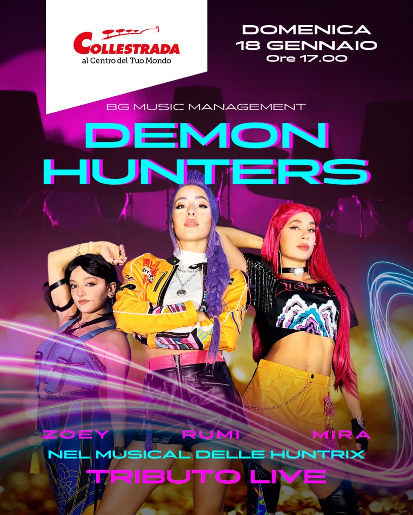 Domenica 18 gennaio, alle ore 17,00, le protagoniste del film di animazione – Rumy, Zoey e Mira – porteranno sul palco “Il Musical Tribute Live delle Huntrix”, dove il bene e il male si sfidano tra canzoni potenti, combattimenti spettacolari e un destino che non concede seconde possibilità. Uno spettacolo live ricco di energia, musica e coreografie che sta conquistando il pubblico di tutte le età.