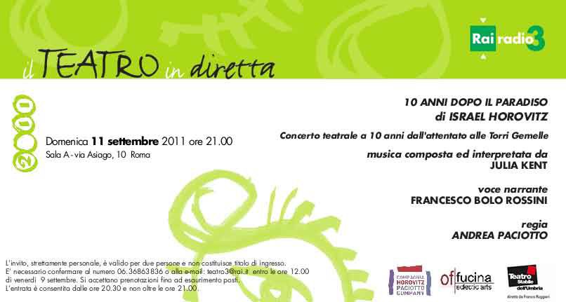 In occasione del decimo anniversario dell'attentato alle Torri Gemelle di New York, la Compagnia Horovitz-Paciotto di Spoleto ha voluto realizzare un concerto teatrale in due atti “10 ANNI DOPO IL PARADISO” che andrà in scena l'11 settembre a Roma nella Sala A di Via Asiago ed in Diretta Radio RAI 3 dalle ore 21.00