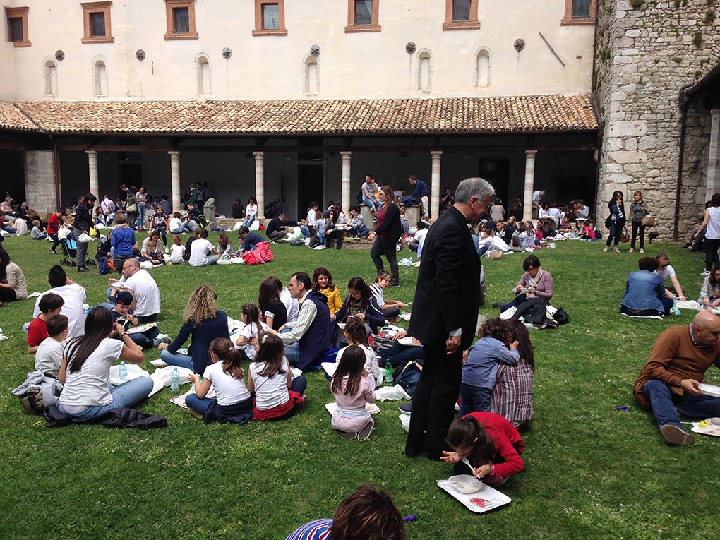 «Siamo qui per il gusto di stare insieme e dire che fare famiglia è bello, vale la pena, anche se non sempre è facile». Con queste parole l’arcivescovo di Spoleto-Norcia, mons. Renato Boccardo, ha salutato le oltre cinquecento persone giunte domenica 16 aprile al Chiostro di S. Nicolò di Spoleto per partecipare alla quarta edizione della Festa della Famiglia, organizzata dall’Ufficio della Pastorale familiare diocesano. Mamme, papà, nonni, nonne e tantissimi bambini e ragazzi sono stati accolti da un’accurata animazione predisposta dalla Pastorale giovanile diocesana. Poi, i più piccoli sono stati affidati ad una equipe educativa della Cooperativa “Il Cerchio” e più grandi hanno svolto attività con gli animatori della Pastorale giovanile. Gli adulti, invece, nella sala grande del Chiostro, hanno dialogato sul tema della giornata, “Misericordiando in famiglia”, con mons. Giovanni Tonucci arcivescovo-prelato di Loreto, con Luciano Moia giornalista del quotidiano Avvenire e con i coniugi Antonella e Nicola Lops dell’associazione Retrouvaille. Ha moderato Francesco Carlini dell’Ufficio stampa della Diocesi. Presente il sindaco di Spoleto Fabrizio Cardarelli, che ha salutato i convenuti.