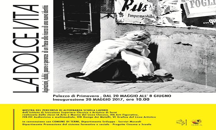 Palazzo Primavera da sabato 20 maggio a giovedì 8 giugno ospiterà la mostra La Dolce Vita: aspirazioni, dubbi, paure e speranze di un Paese alla ricerca di una nuova identità, una iniziativa nata nell’ambito del progetto alternanza scuola lavoro dell’Istituto di Istruzione Superiore Classico e Artistico in convenzione con Comune di Terni, dipartimento sviluppo, servizi Museali dipartimento promozione sistema formativo e sociale, cinema e scuola che si ispira al celebre film di Federico Fellini.