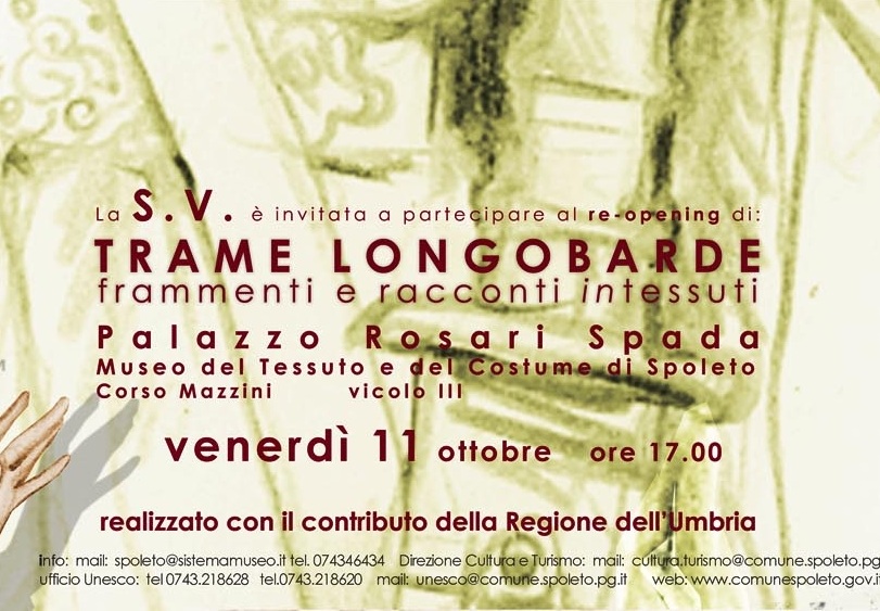 Re opening venerdì 11 ottobre alle ore 17 della mostra “Trame Longobarde” al Museo del Tessuto e del Costume di Spoleto. L'esposizione, già inaugurato lo scorso luglio, presenta uno straordinario lavoro di ricostruzione dei tessuti utilizzati dalle popolazione longobarde partendo dalle testimonianze archeologiche e un'accurata proposta delle antiche tecniche di tessitura. I tessuti in esposizione sono presentati in forma d'abito, corredati da approfondite schede ricostruttive, sullo sfondo di pannelli con disegni che illustrano la vita quotidiana dei Longobardi. A settembre è prevista l'apertura ufficiale della mostra, che verrà arricchita anche di un modulo didattico, con l'obiettivo di avvicinare i bambini alla cultura longobarda attraverso lo studio dei tessuti.