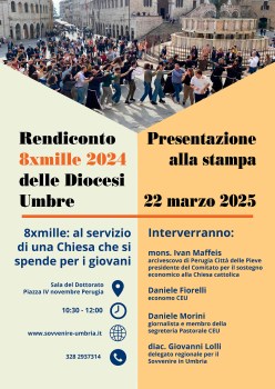 Sarà presentato in conferenza stampa a Perugia, sabato 22 marzo, alle ore 10.30, presso la Sala del Dottorato delle Logge della Cattedrale di San Lorenzo, il Rendiconto 8xmille 2024 delle Diocesi umbre dal titolo: “8xmille al servizio di una Chiesa che si spende per i giovani”.