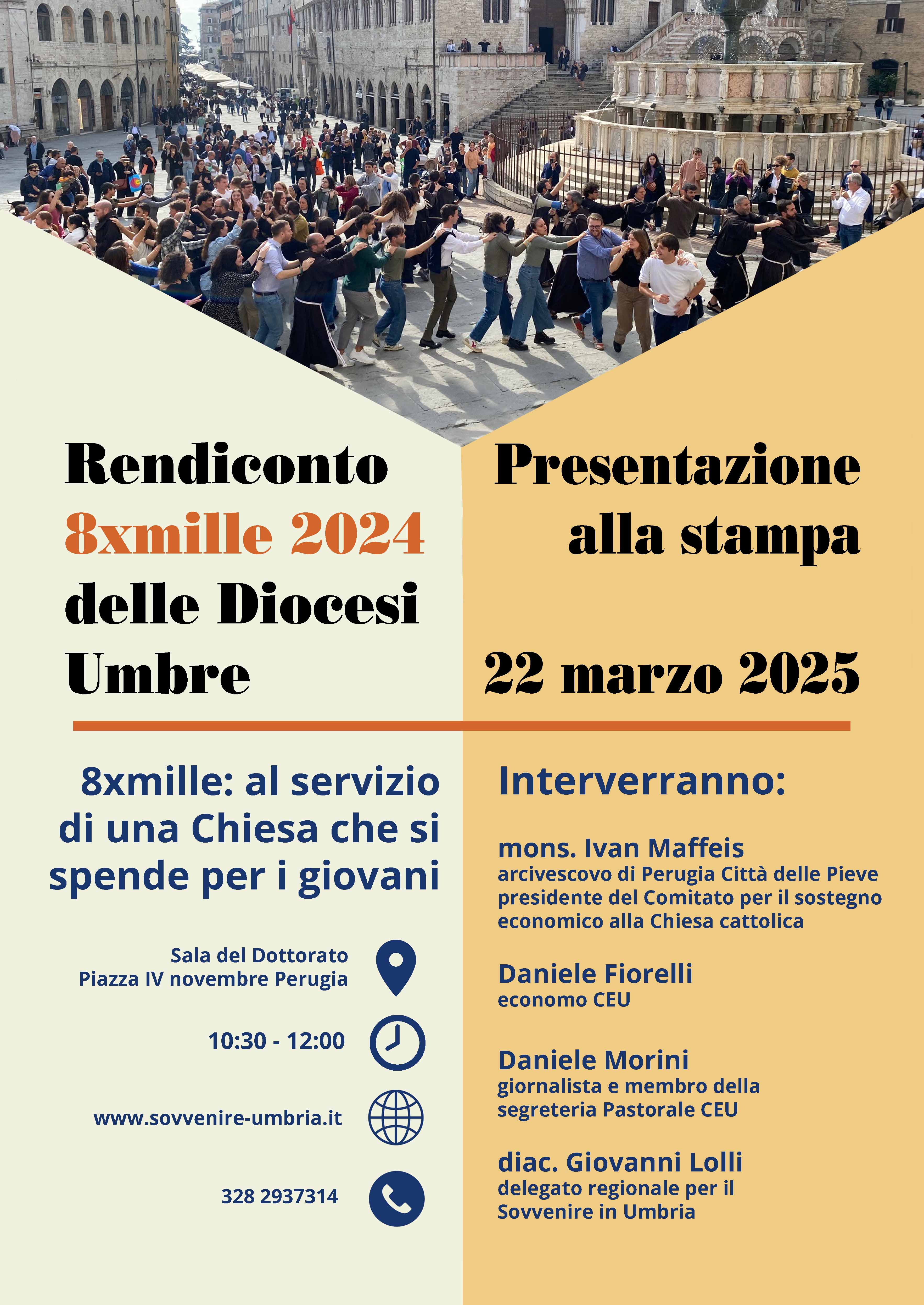 Sarà presentato in conferenza stampa a Perugia, sabato 22 marzo, alle ore 10.30, presso la Sala del Dottorato delle Logge della Cattedrale di San Lorenzo, il Rendiconto 8xmille 2024 delle Diocesi umbre dal titolo: “8xmille al servizio di una Chiesa che si spende per i giovani”.