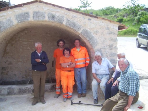 A san Marco, più di mille metri di altitudine, il presidente della Comunanza agraria Italo Monaldi, insieme a Luigi, Pietro e Vincenzo abitanti del posto, è soddisfatto di fronte alla rinascita del lavatoio e della fonte settecentesca a cui le donne un tempo attingevano l’acqua potabile, qualche decina di metri fuori dal castello. “San Marco è stato uno dei primi paesi ad avere l’acqua direttamente nelle case –dice Monaldi – la conduttura fu costruita a spese della Comunanza nel 1953 quando ancora non c’era nemmeno la strada carrabile. Prima di quella data le donne venivano ad attingere l’acqua con la conca di rame, portando in braccio i figlioletti e tenendo la conca in bilico sopra il capo, anche d’inverno”.