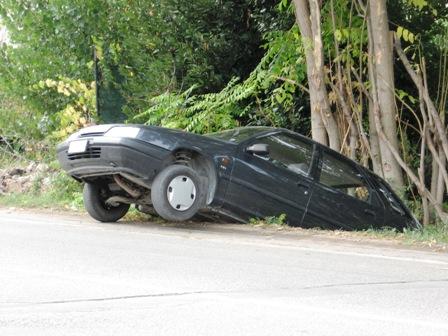 Probabilmente la macchina era stata lasciata sfrenata, e la lieve pendenza del terreno ci ha messo del suo. Così l'automobile è finita con il muso all'insù, senza nessuna possibilità per ilproprietario di poterla rimettere in carreggiata.