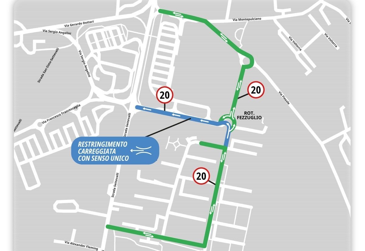 • Senso unico di marcia sul tracciato stradale tra Via Chiusi (Rotatoria Fezzuoglio) e Via Settevalli in tale direzione.