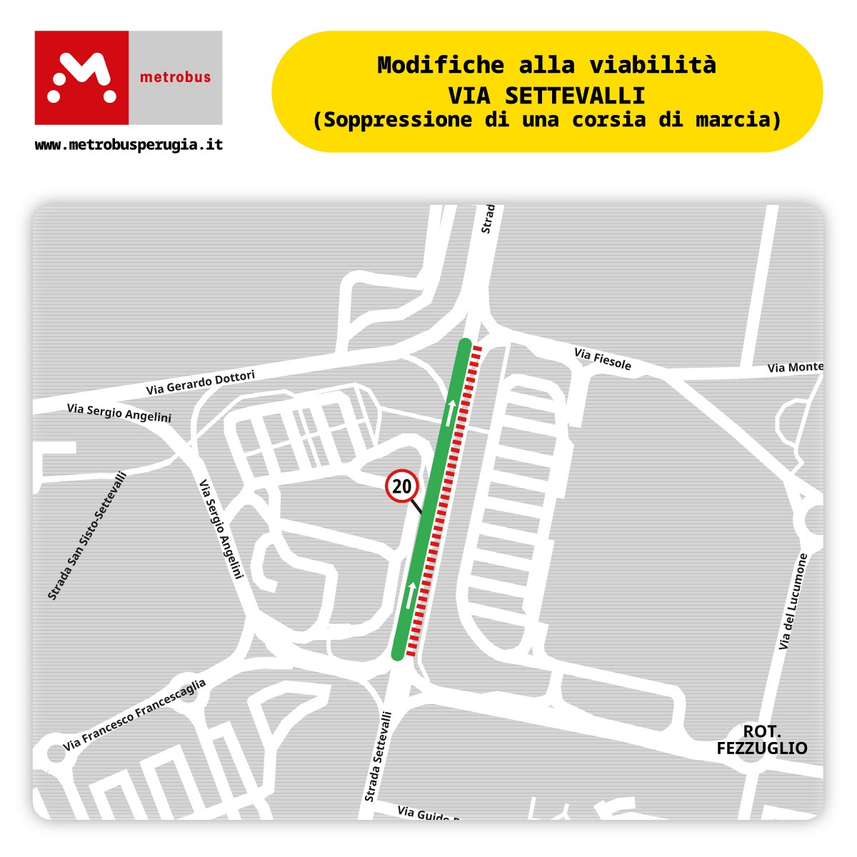 - Soppressione di corsie di marcia in Via Settevalli disciplinato da idonea transennatura e specifica segnaletica anche notturna di pericolo, nel tratto parallelo al centro commerciale “Emisfero” compreso fra la traversa che adduce alla Rotatoria Fezzuoglio e Via Fiesole, da istituire progressivamente in relazione allo sviluppo dei lavori;