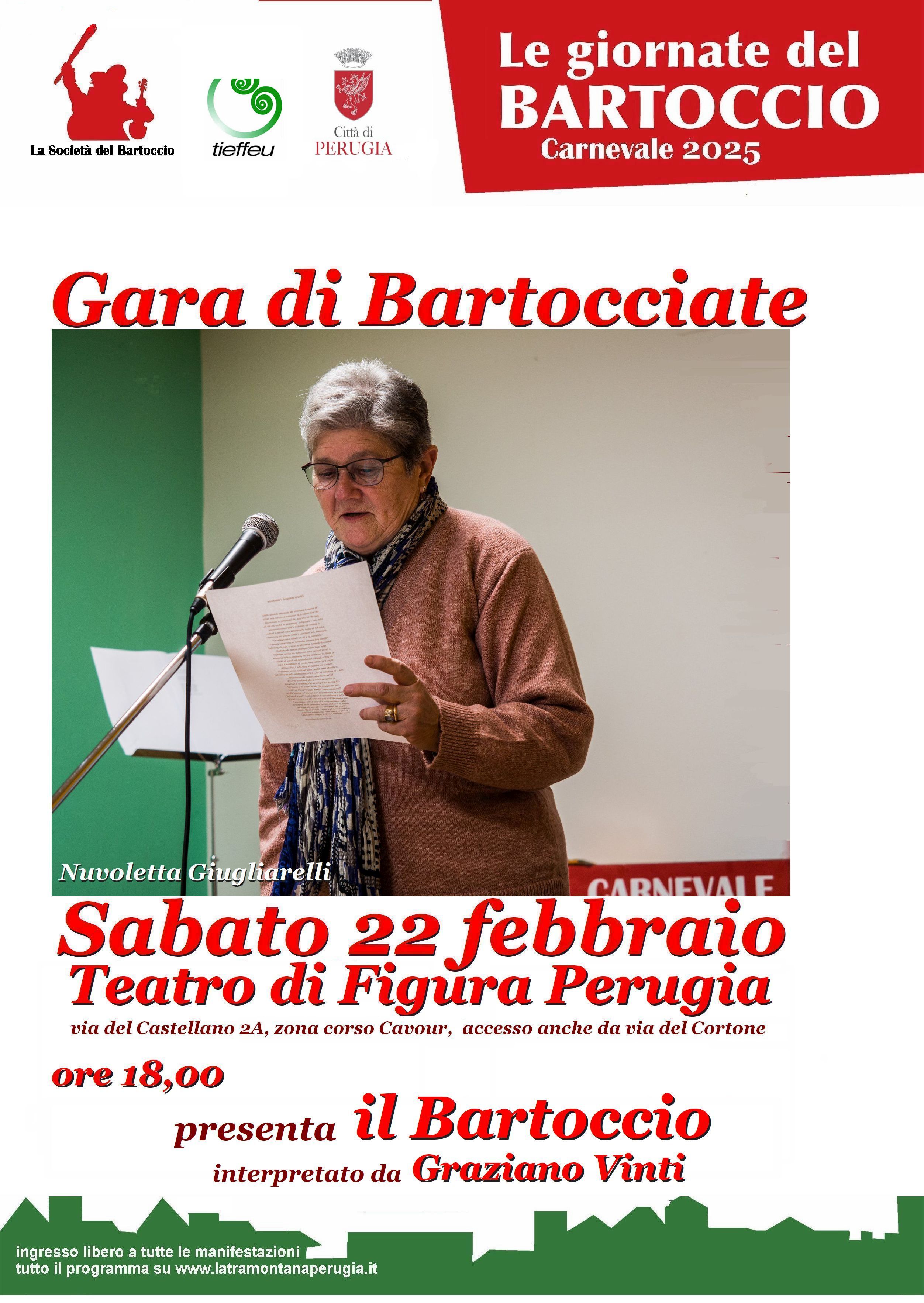La annuale Gara di Bartocciate, organizzata dalla Società del Bartoccio, si svolgerà il 22 febbraio alle ore 18,00 al Teatro di Figura di Perugia. Presentatore e mattatore della serata sarà il Bartoccio, interpretato da Graziano Vinti.