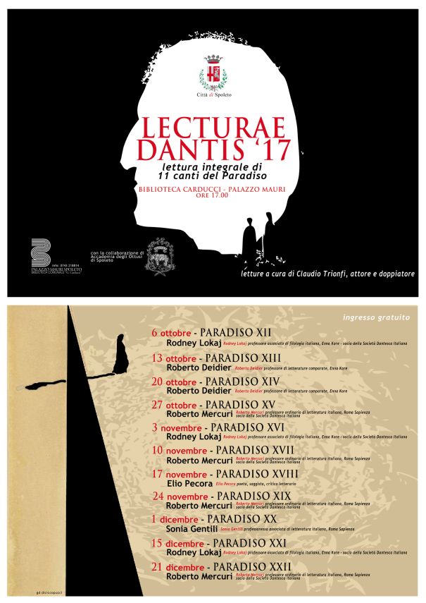 Dopo il successo degli anni passati prosegue la lettura integrale della Divina Commedia di Dante: dal 6 ottobre al 21 dicembre, ogni venerdì pomeriggio alle ore 17, alla Biblioteca Comunale di palazzo Mauri, è in programma il commento e la lettura di undici canti del Paradiso, dal canto XII al XXII. La lettura dei canti è affidata all’attore Claudio Trionfi, il commento è a cura di vari docenti universitari, sotto il coordinamento del prof. Rodey John Lokaj.