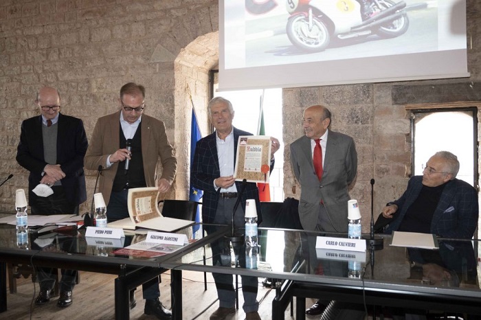 La consegna dell’attestato al mito delle ruote – il pilota più vincente nella storia di questo sport (in carriera ha vinto 123 gare su 190, conquistando 15 titoli mondiali) – è avvenuta ieri pomeriggio (2 aprile) nella sala trecentesca del palazzo comunale di Gubbio, in occasione della presentazione del nuovo libro scritto dall’avvocato Piero Pieri “Tourist Trophy, il sogno continua”.