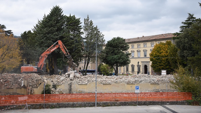 Dopo aver abbattuto la fila di finestre a piano terra sul lato all’angolo tra via Lapi e via Labriola, l’escavatore da demolizione dell’azienda Pelliccia Scavi SRl di Perugia – che da lunedì 8 ottobre ha iniziato ad abbattere lo storico edificio – è sbucato in cima al cumulo di macerie creato dal crollo di muri e tetto.