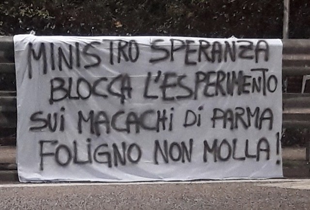 Il blitz è scattato in contemporanea in 25 città italiane, tra le quali, in Umbria, a Perugia e Foligno, dove sono comparsi striscioni che invitano il ministro della Sanità, Roberto Speranza, a proibire all’Università di Parma di proseguire gli esperimenti scientifici sui macachi.