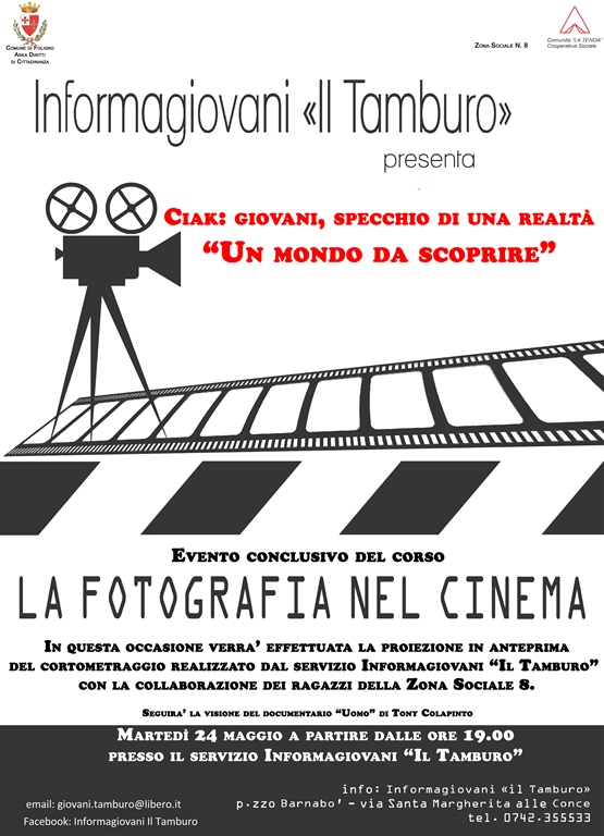 “Ciak: giovani, specchio di una realtà. ‘Un mondo da scoprire’”: è questo il titolo del cortometraggio realizzato dall’Informagiovani “Il Tamburo” con la collaborazione dei ragazzi della Zona Sociale n. 8 che, martedì 24 maggio, dalle ore 19, costituirà a Palazzo Barnabò (via Santa Margherita) l’evento conclusivo del corso “La fotografia nel cinema. Dal reportage fotografico al cinema documentario”. Alla proiezione, patrocinata dall’area diritti di cittadinanza del comune di Foligno, Zona Sociale n. 8 e Comunità “La Tenda” Cooperativa Sociale, seguirà la visione del documentario “Uomo” di Tony Colapinto.
