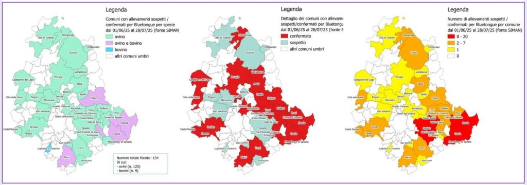 La malattia si è manifestata in Umbria da giugno 2025 e sono 134 gli allevamenti sospetti (125 di ovicaprini e 9 di bovini): in 69 allevamenti (distribuiti su 28 Comuni) è stato confermato il focolaio e 995 capi sono deceduti. Il tasso di mortalità è del 4,4% per gli ovicaprini. Alcune aree dell’Umbria mostrano una mortalità dello 0% mentre altre presentano tassi più elevati di contagi e di mortalità. La malattia risulta endemica su tutto il territorio nazionale ed è quindi diversa dalle malattie epidemiche, per questo non sono previsti indennizzi e abbattimenti. Il regolamento comunitario prevede programmi di eradicazione facoltativa. Il vaccino è stato consigliato a tutti gli allevatori – benché esistano diverse varianti della lingua blu – ed è disponibile dai primi giorni del contagio. La Regione ha attivato strumenti tecnici e normativi a supporto degli allevatori.