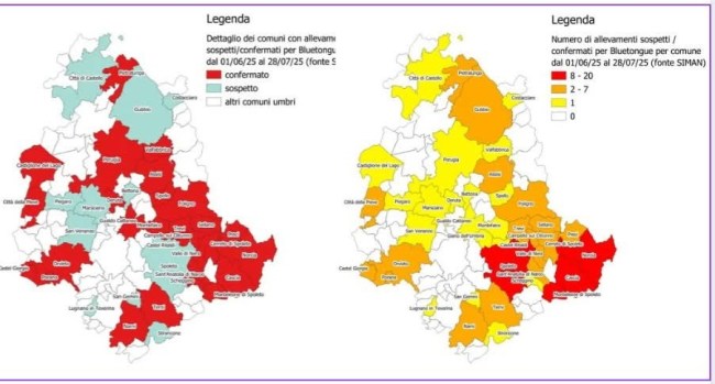 La malattia si è manifestata in Umbria da giugno 2025 e sono 134 gli allevamenti sospetti (125 di ovicaprini e 9 di bovini): in 69 allevamenti (distribuiti su 28 Comuni) è stato confermato il focolaio e 995 capi sono deceduti. Il tasso di mortalità è del 4,4% per gli ovicaprini. Alcune aree dell’Umbria mostrano una mortalità dello 0% mentre altre presentano tassi più elevati di contagi e di mortalità. La malattia risulta endemica su tutto il territorio nazionale ed è quindi diversa dalle malattie epidemiche, per questo non sono previsti indennizzi e abbattimenti. Il regolamento comunitario prevede programmi di eradicazione facoltativa. Il vaccino è stato consigliato a tutti gli allevatori – benché esistano diverse varianti della lingua blu – ed è disponibile dai primi giorni del contagio. La Regione ha attivato strumenti tecnici e normativi a supporto degli allevatori.