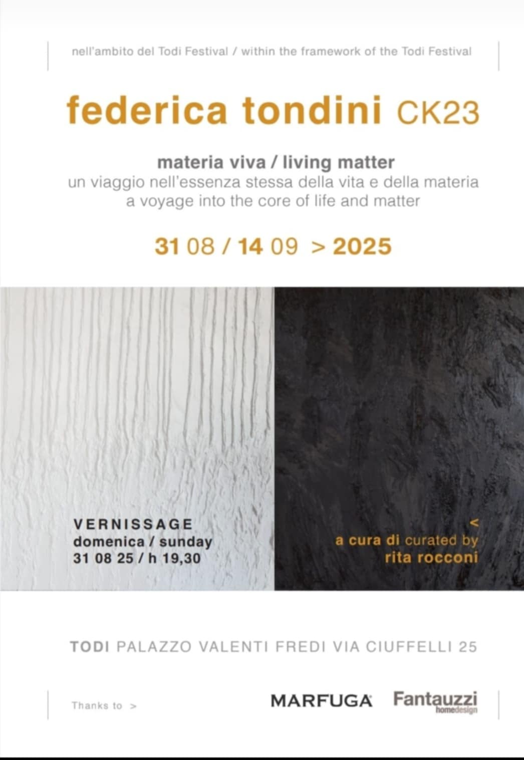 Todi, agosto 2025 — Nell’ambito della nuova edizione del Todi Festival, l’artista Federica Tondini CK23 presenta la mostra personale “Living Matter/Materia viva”, un’intensa e coinvolgente esplorazione della pittura materica come linguaggio emotivo e corporeo. L’esposizione, curata da Rita Rocconi, si terrà dal 31 agosto al 14 settembre 2025 negli spazi storici di Palazzo Valenti Fredi, nel cuore della città umbra e sarà inaugurata domenica 31 agosto alle 19.30 alla presenza del sindaco di Todi Antonino Ruggiano e del direttore artistico del Festival Silvano Spada