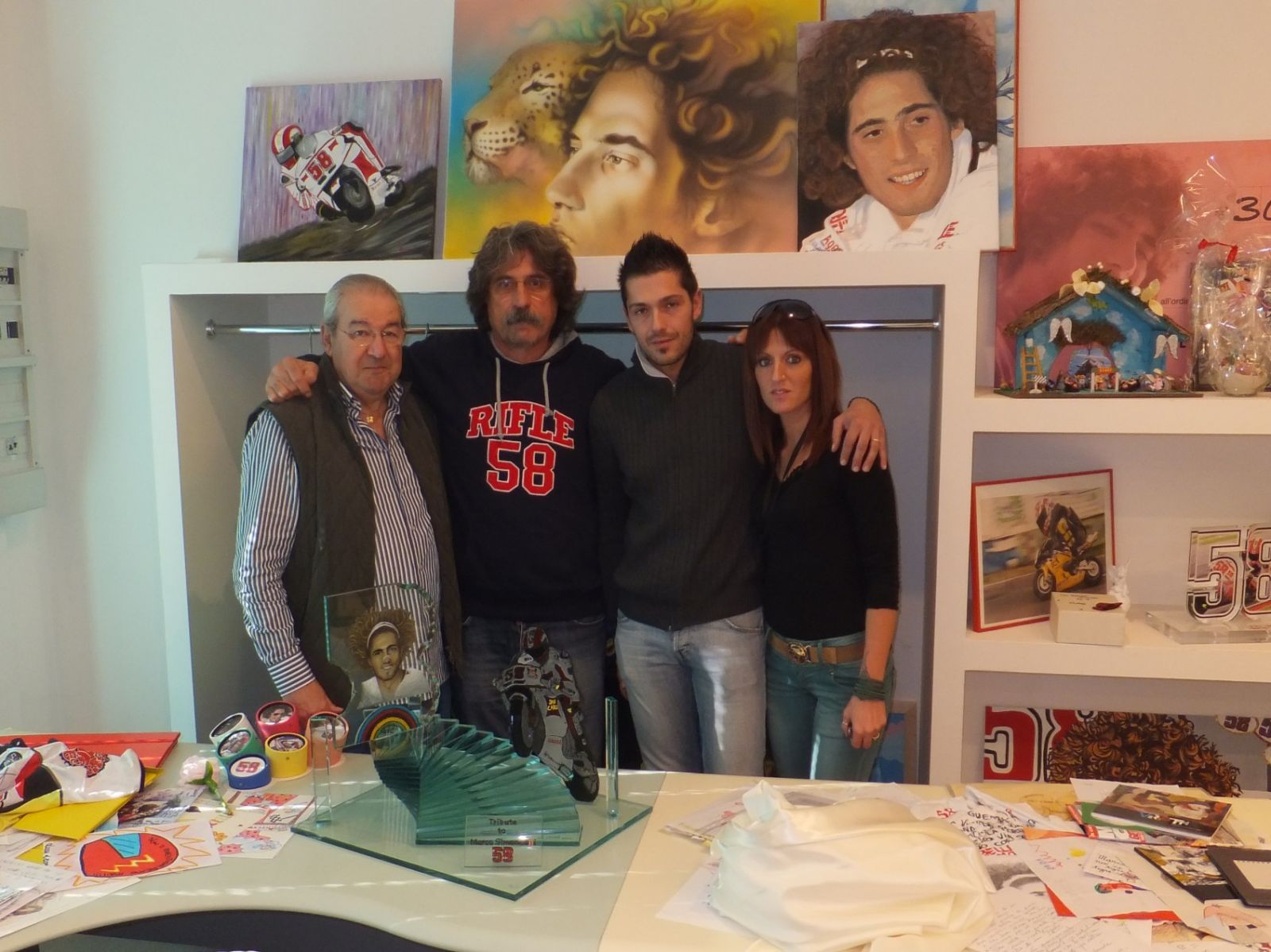 E' passato già un anno, da quella tragica scomparsa che resterà per sempre nel cuore di tutti: era il 23 ottobre quando l'atleta Marco Simoncelli, morì giovanissimo durante una gara in sella alla sua amatissima motocicletta. Migliaia di fans da tutto il mondo continuano a inviare tributi e dimostrazioni di affetto alla famiglia di Coriano tra cui anche lo spoletino Daniele Conti, che prosegue la tradizione già avviata dal padre Paolo, di consegnare premi creati artigianalmente nella vetreria di famiglia, ai piloti che maggiormente si sono distinti nel panorama internazionale del motociclismo. E proprio alcuni giorni prima della triste ricorrenza, Daniele ha voluto dimostrare la sua solidarietà alla famiglia dell'atleta prematuramente scomparso consegnandole il suo personale ricordo. Grazie all'intervento di Alfredo Sabatini, Daniele con la moglie è riuscito ad arrivare a Coriano, il paese natale del campione dai riccioli d'oro e nel quale tuttora risiedono i genitori che, per altro, hanno realizzato il progetto di una Fondazione, dedicata al figlio, in favore di bambini e ragazzi disagiati. Con orgoglio e molta commozione, Paolo Simoncelli ha accolto la giovane coppia e ricevuto il tributo raffigurante Marco che impenna con la sua moto su una scala rivolta verso l'arcobaleno. Un legame quello tra la famiglia Simonecelli e la città di Spoleto che si rafforza ancora visto il recente intervento di Kate, fidanzata del compianto Marco, che in una conferenza stampa tenutasi presso il Municipio della città del Festival ha presentato l’evento in programma per il prossimo 15 Dicembre al Chiostro di San Nicolò. Una serata dedicata al Sic, come lo chiamavano i suoi fan, in cui verrà messa all’asta una speciale bicicletta tributo. Il ricavato sarà interamente devoluto alla Fondazione che, sia in Italia che all'estero, sta portando avanti una serie di progetti umanitari in favore dei giovani in difficoltà.