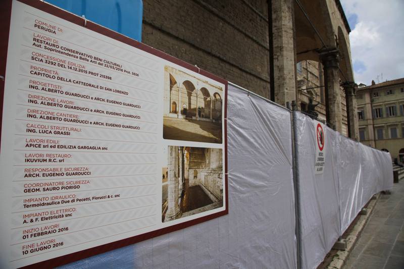 Logge di Braccio in piazza IV Novembre a Perugia: “lo sapete che…non saranno più vostre?“. E’ quanto chiedono al popolo di Facebook i ragazzi del gruppo Umbria Grida Terra, dal loro account. Il perché della domanda è presto detto: come anticipato dalla stampa locale nei giorni scorsi, e come si vede dalle nostre foto, le logge sono interessate, in questi giorni, dai lavori di realizzazione di un nuovo bar-cioccolateria, a firma del patron di Eurochocolate, Eugenio Guarducci. Lavori che dovrebbero terminare il 10 giugno 2016, in base a quanto riportato dal cartellone di fronte al cantiere.